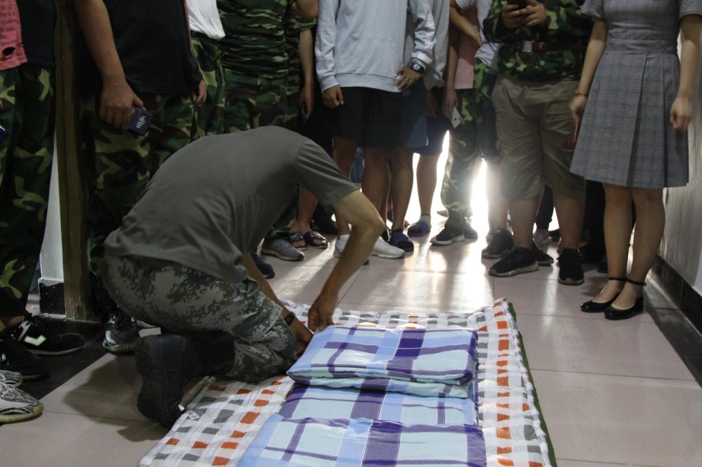 在新生宿舍,教官亲自演示了如何整理内务,说明了宿舍的卫生标准,着重强调了在内务整理中容易忽略的细节,并按军训内务规定对员工宿舍中被子的折叠、铺面、床下物品摆放、桌柜的物品摆放、其余的物品摆放、门窗的擦拭、床的擦拭、桌柜的擦拭、墙壁卫生、地面卫生、空气质量等提出了严格的要求。例如:“毛巾要叠两次放在脸盆边上”,“鞋要放整齐,成直线摆放”,“生活和学习物品要划分功能区来摆放”,“地面要整洁,决不能留卫生死角”等。宿舍是老员工生活、学习、交流的主要场所之一,舒适、整洁的公寓可以令大家保持愉悦的心情,令学习工作事半功倍。因此,无论是在军训过程中还是平日生活里,都应该坚持宿舍卫生制度,养成良好的生活习惯。