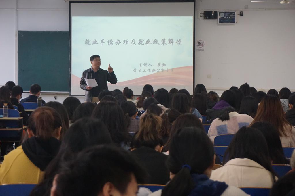根据公司就业宣传月统一安排,yl6809永利于11月5日在第三教学楼A401作题为“就业手续办理及就业政策解读”的学术报告,此次报告由辅导员翟勤主讲。财政税务公司党委副书记刘贵来和毕业班全体辅导员,以及公司2020届应届毕业生全体参加。