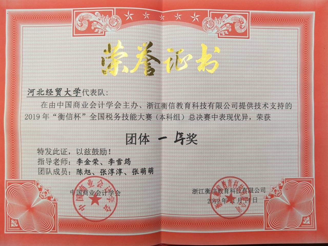 11月11—14日, 2019年“衡信杯”全国税务技能大赛总决赛在杭州举行,yl6809永利代表队在本次比赛中荣获团体一等奖,张淳淳同学获得个人三等奖。张淳淳、陈旭、张萌萌同学获得衡信科技教育有限公司免试入职通知书。李金荣老师荣获优秀指导教师称号,李雪筠老师荣获优秀带队教师称号。