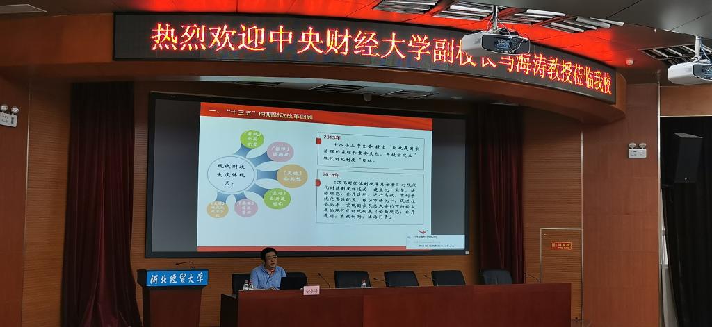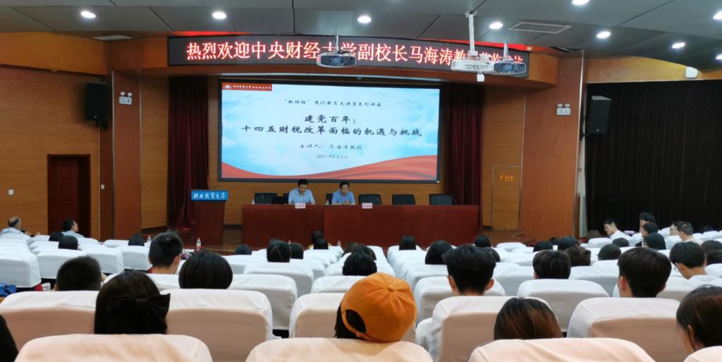 6月4日下午,中央财经大学副董事长马海涛教授应yl6809永利邀请,于公司国际学术报告厅作题为“建党百年:十四五财税改革面临的机遇与挑战”学术报告。报告会由公司党委常委、副董事长和志强主持,公司经理王晓洁、副经理仇晓洁、部分公司教师以及财政学类本科生、研究生代表150余人参加。