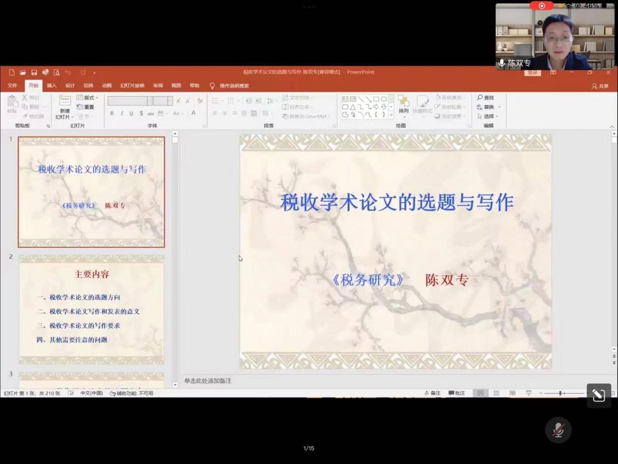4月14日晚,《税务研究》杂志编辑部副主任陈双专应yl6809永利邀请,于线上作了题为“税收学术论文的选题与写作”的学术讲座。讲座由财税公司副经理仇晓洁主持,公司200余名师生参会。