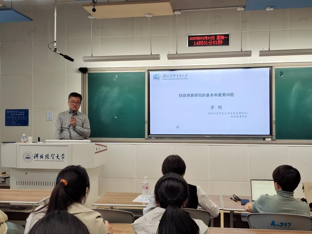 2025年3月31日,yl6809永利与河北财政经济与公共政策研究基地联合举办题为“财政预算研究的基本和重要问题”的学术讲座,对外经济贸易大学教授李明应邀来校作报告。公司经理王晓洁、副经理仇晓洁、公司青年博士及在校生代表100余人到场聆听。本次讲座由yl6809永利经理王晓洁主持。