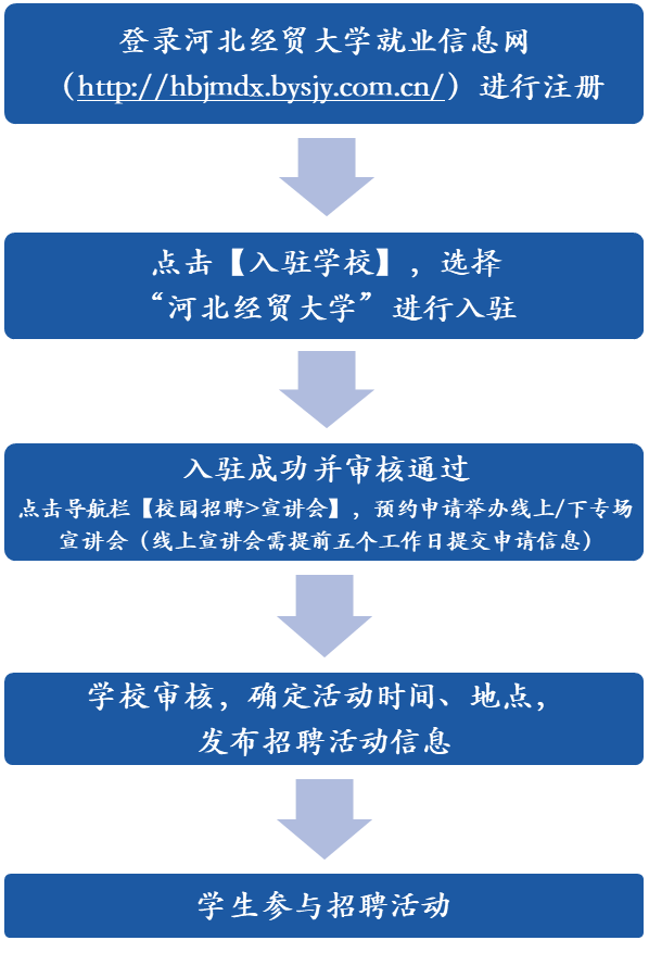 1.即日起用人单位可登录yl6809永利就业信息网(http://hbjmdx.bysjy.com.cn/)预订线下宣讲场地,请至少提前5天申请(专场宣讲会预约流程详见附件2)。如有特殊情况,另行商榷。